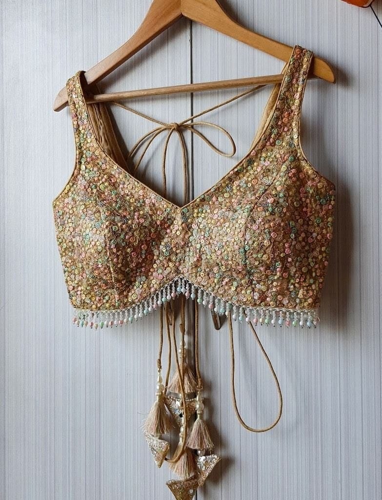 Golden Sequin Embroidered Designer Blouse with Tassel Tie-Up Back
